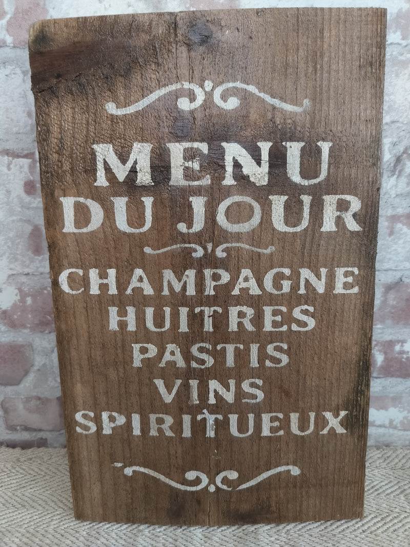 Transform your space with this charming French inspired Upcycled Handmade Wooden Menu du Jour Sign, crafted from upcycled wooden boards.