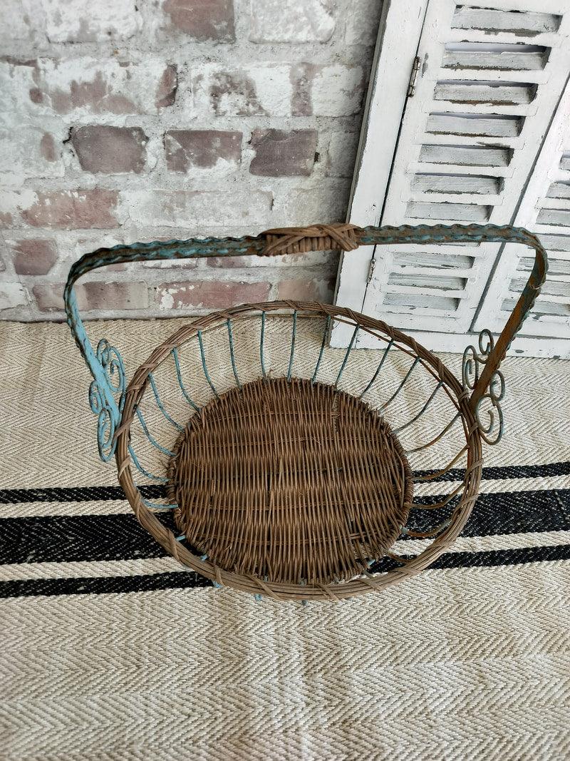 This beautiful vintage basket combines rustic character with elegant French country flair. Featuring a woven wicker base and distressed blue metal frame with beautiful patina giving added charm.