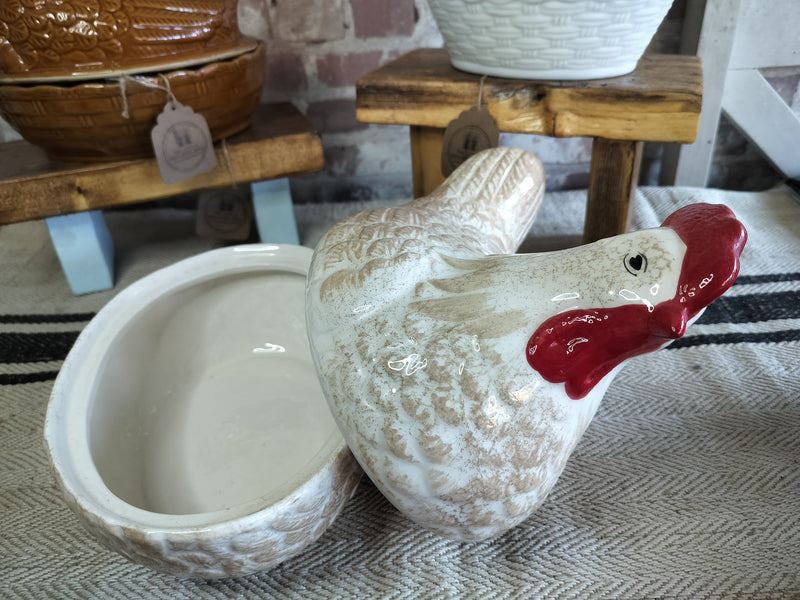 Bring a touch of rustic French charm into your home with this beautiful vintage ceramic hen on nest, a perfect statement piece for any farmhouse-inspired kitchen or dining room.